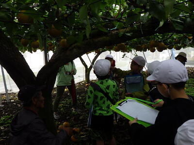まず,梨が実っている様子を見ながら,梨農家の渡邉さんの説明を聞きました。