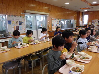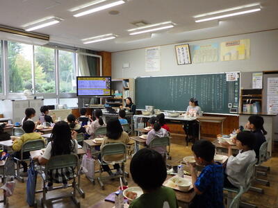 給食を食べながら,市の教育委委員会が作成した『宮っ子ランチ(秋)「船頭鍋ランチ」について学ぼう』を
