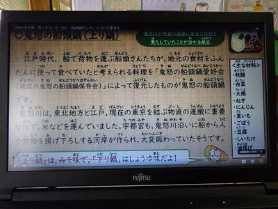 見ました。船頭まつりで食べる「船頭鍋」が出てきたときは,子供たちは,にこっとしていました。