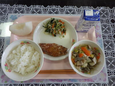 宮っ子ランチ秋の献立は,麦入りごはん,牛乳,モロのから揚げ,船頭鍋,切干大根のぽん酢あえ,梨 です。