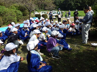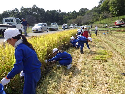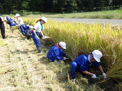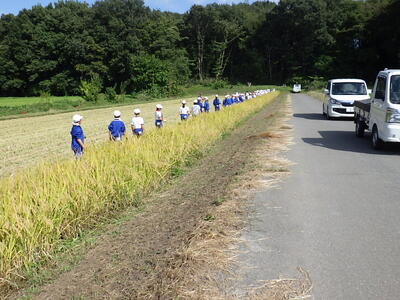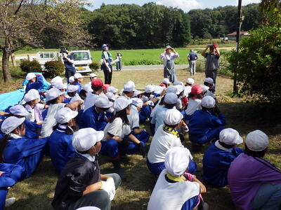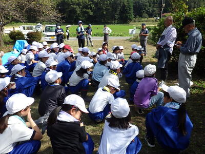 9月26日(金)に、「高田沼を愛する会」「上籠谷自治会」「PTA 第5学年学年委員」等の皆様にご支援いただきながら、農業体験(稲刈り)を実施しました。「高田沼を愛する会」の古山会長や「上籠谷自治会」川上会長からご挨拶を頂いた後、山口 様から稲の刈り方を指導いただきました。初めは恐る恐る鎌を使っていた児童も次第に慣れて、笑顔で「切る音が気持ちいい。」と言いながら手際よく稲を刈り取っていました。児童一人一人が稲刈り体験を通して、もち米の収穫を喜び、米作りや里山の自然について興味・関心を高めることができました。(今回収穫したもち米は,清南まつりで使われるそうです。)