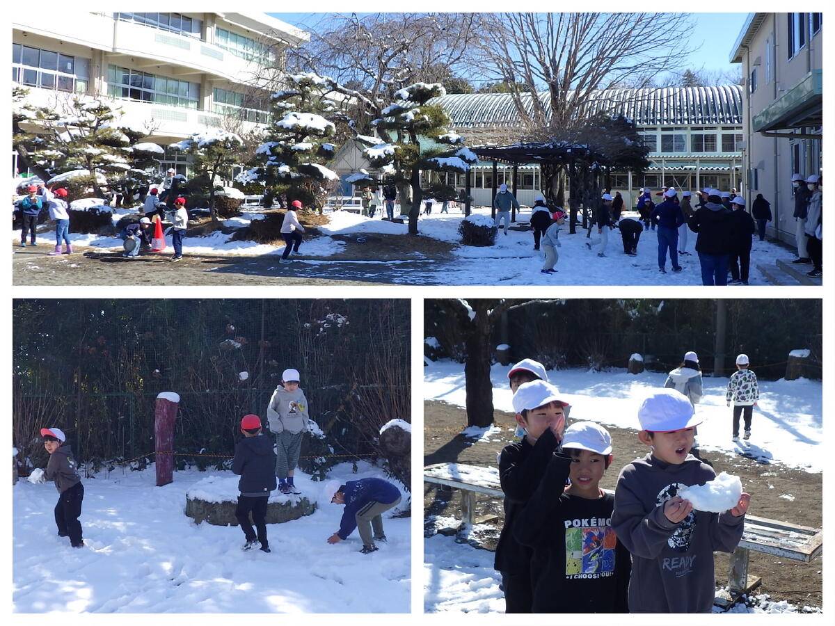 休み時間になると、子供たちは寒さを吹き飛ばすような歓声を上げ、一斉に校庭へ駆け出していきました。校庭のあちこちで雪ダルマ作りが始まり、雪合戦では学年を越えて元気いっぱいに走り回る姿が見られます。冬ならではの自然の恵みを全身で楽しみ、たくましく遊ぶ子供たちの姿がみられました。