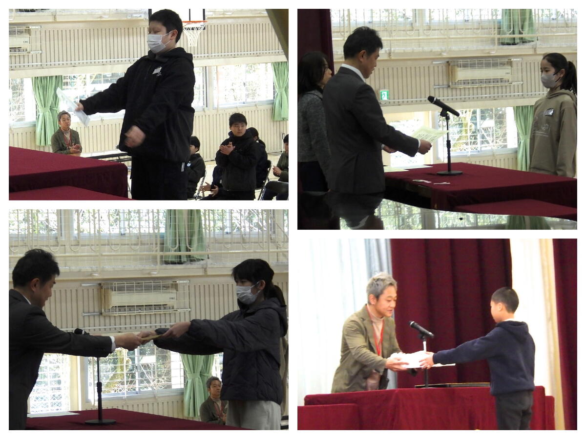 3月12日(木)の卒業式予行練習の後に、善行児童の表彰を行いました。「宇都宮市青少年賞・全校児童表彰・宮っ子心の教育表彰・宇都宮模範青少年賞・南っ子賞・宮っ子心の教育表彰 教育長奨励賞」を、立派な態度で受け取ることができました。PTA記念品贈呈式では、校章の入った木製のハンガーが、PTA会長から卒業生代表へ贈られました。