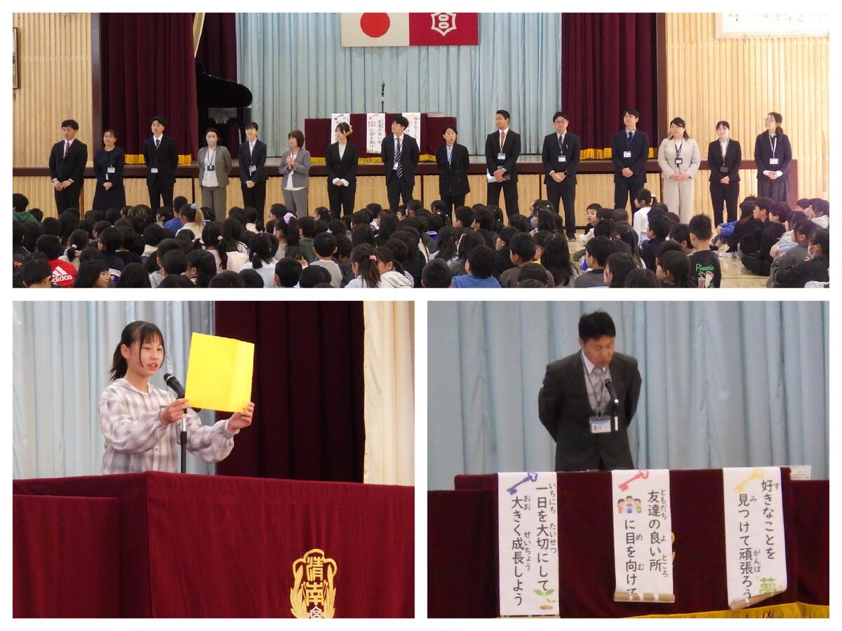 6年生の代表児童が、着任式では9名の先生を迎える言葉を、始業式では1学期に頑張りたいことを堂々と発表することができました。6年生としての自覚が随所に感じられる立派な内容でした。校長からは、ミラノ・コルティナ五輪で,この種目で日本初の金メダルを獲得した「りく(三浦璃来)りゅう(木原龍一)」ペアの話を交えながら、1年間を上手に過ごすための3つの鍵について話がありました。新しい教室、新しい先生、新しい友達との出会いを大切にして、児童一人一人が大きく成長することを期待しています。