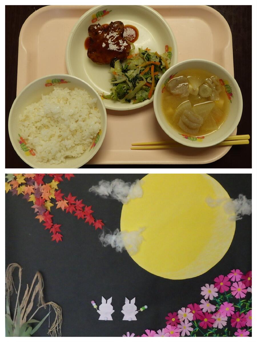 今日10月6日(月)は旧暦8月15日にあたり、夜には「中秋の名月」が昇ります。今日の給食は「じゅうごやこんだて」ということで、うさぎがたハンバーグや味噌けんちん汁が出されました。1階音楽室の壁面には、環境整備ボランティアの皆様による秋の壁面飾りが掲示されています。
