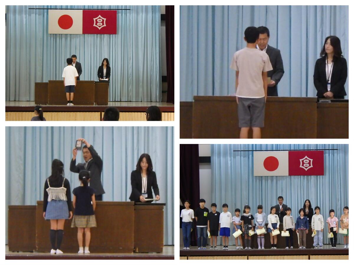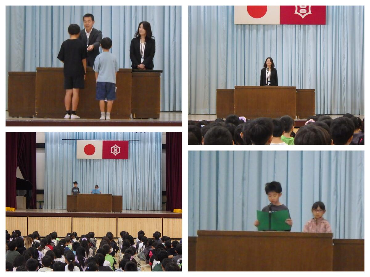 1年生98日、2~6年生100日の1学期が終わり、始業式が実施されました。初めに、2年生と4年生の代表児童から、「野菜の世話」や「授業中の発表」など、頑張ったことについて発表がありました。落ち着いて堂々とした発表に感心しました。校長先生からは、「4月に話した3つの目標は達成できましたか?1学期に色々なことができるようになったと思います。始業式の前の各種表彰や代表児童の発表の中にも、頑張ったことやできるようになったことがたくさんありましたね。今日、担任の先生からもらう通知表は成長の記録です。お家の人と一緒に見て、大きく成長した自分を褒めてあげてください。」との話がありました。