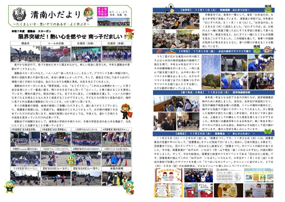 秋晴れの空の下、色づき始めた木々に囲まれ、新校舎に見守られて、令和7年度の運動会がやってきました。今年の運動会スローガンは「限界突破だ!熱い心を燃やせ 南っ子だましい!」です。一人一人が「南っ子だましい」をもって、精一杯活躍していたことが素晴らしかったです。そして、最後まであきらめずに頑張る姿に、大きな感動と勇気をもらいました。運動会を通して、一人一人が大きく成長することができました。それが分かる最高の運動会になりました。