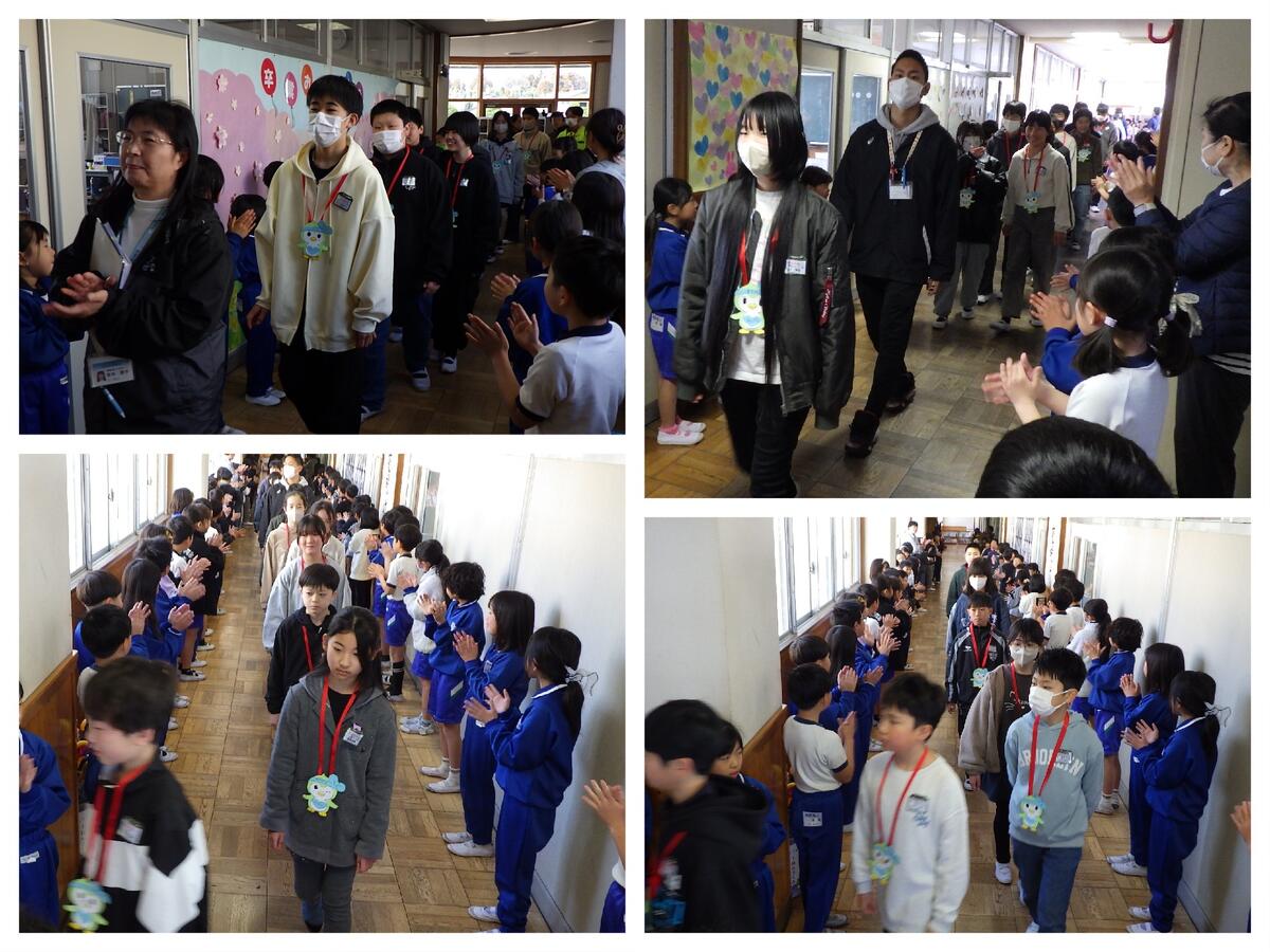 卒業式を明日に控えた3月17日(火)、在校生が廊下で列を作り、6年生を温かく送り出す「歓送の会」を行いました。「僕のこと」のメロディが流れる中、下級生からは「今までありがとう」「中学校でも頑張って」と、心のこもった言葉が次々と贈られました。照れくさそうに、でも誇らしげに胸を張って歩く6年生。 下級生と過ごした日々を懐かしむような眼差しがとても印象的でした。