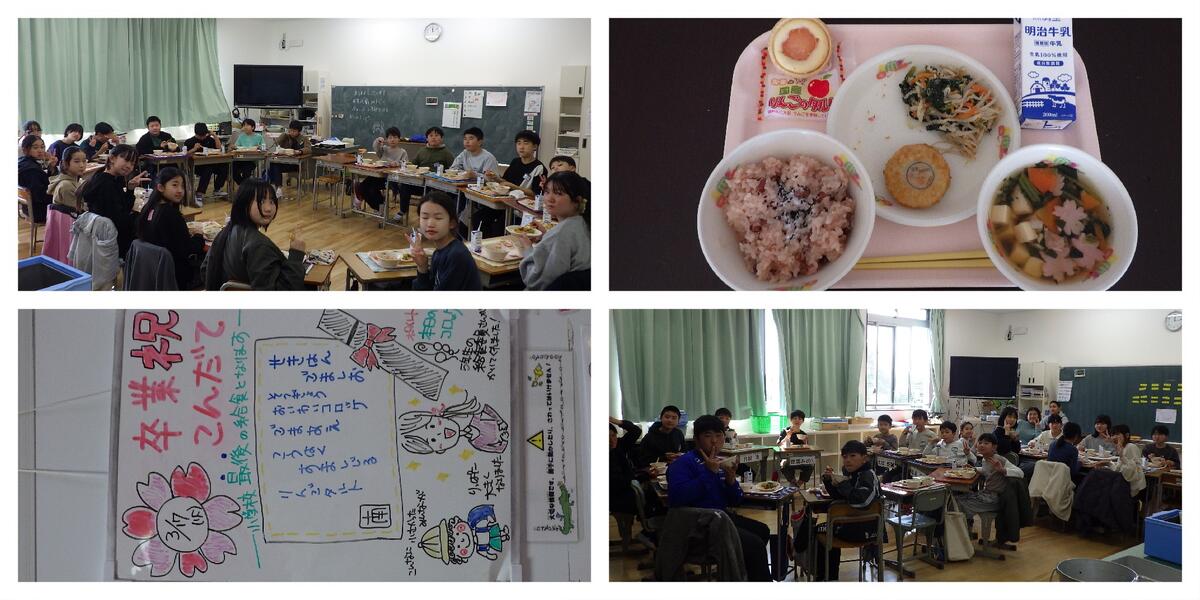 小学校最後の給食は、心を込めた「卒業祝こんだて」です。メインのコロッケには、5年生の給食委員が描いた可愛らしい猫のプリントが添えられ、「卒業おめでとう」と語りかけています。お赤飯に使われているのは、5年生が「高田沼」横の水田で大切に収穫したもち米です。さらに、紅白の澄まし汁には縁起の良い金目鯛が彩りを添えています。感謝と祝福が詰まった、心に残る小学校最後の給食となりました。