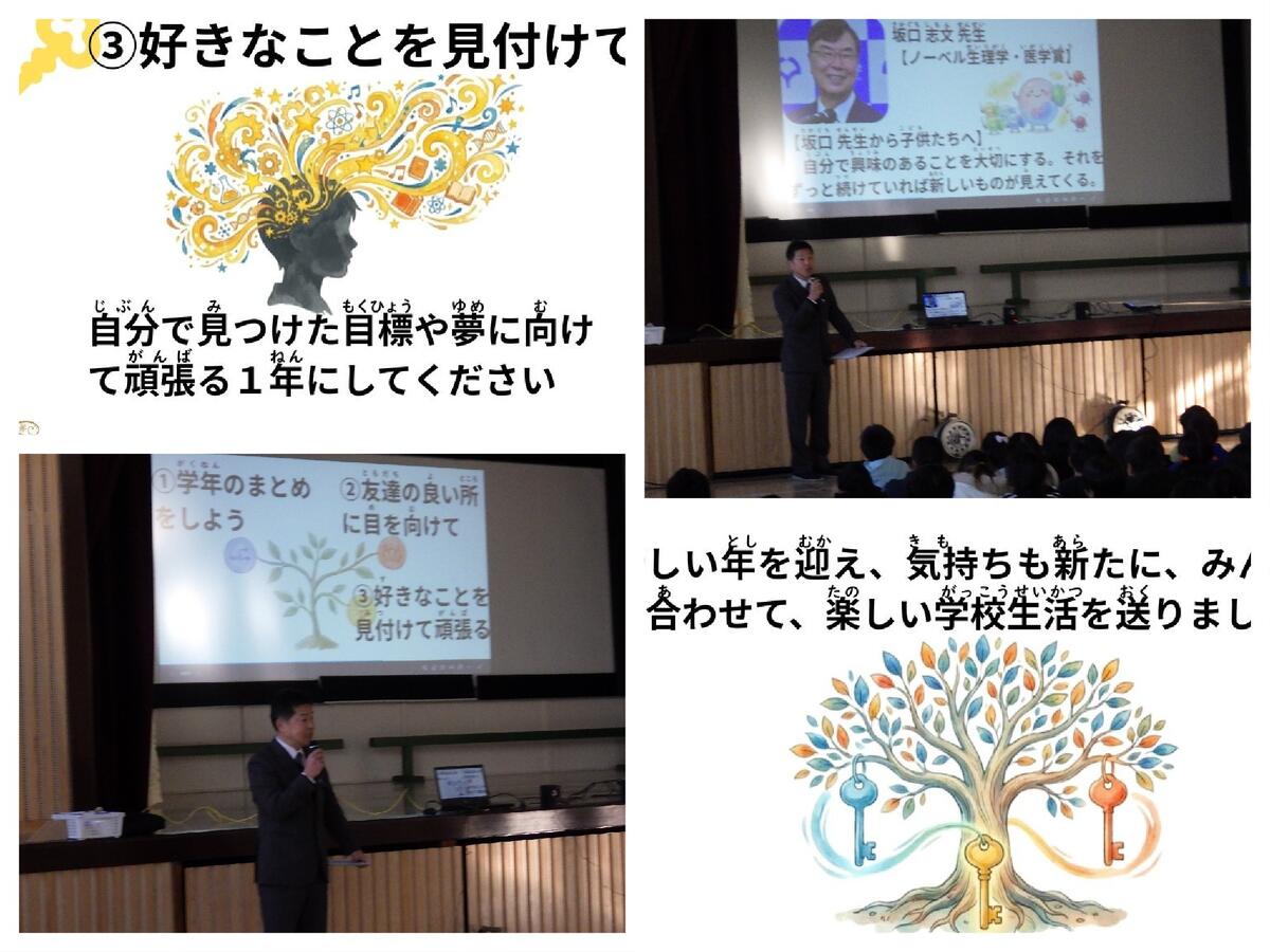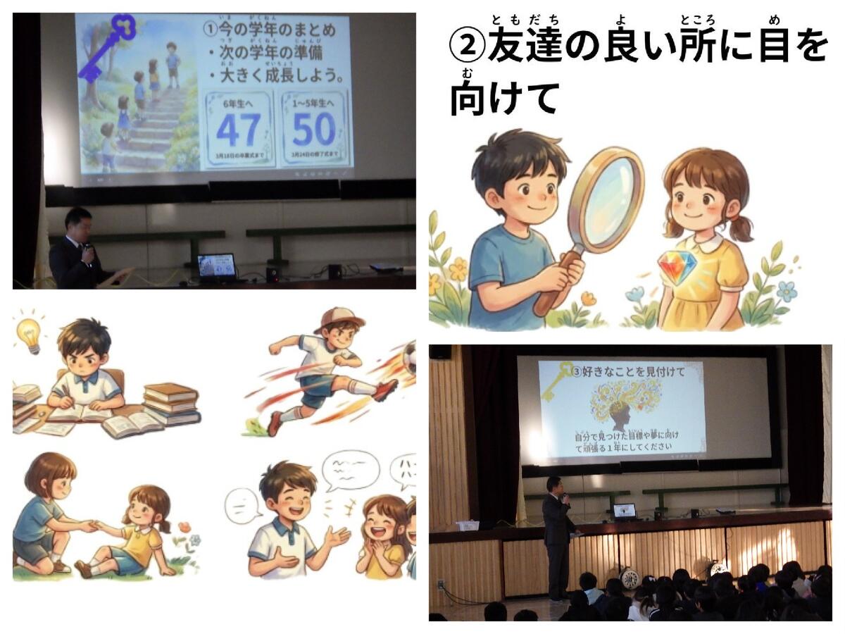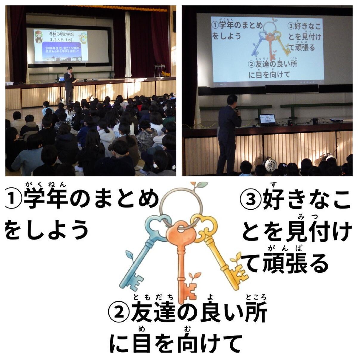 【全児童】冬休み明け朝会の校長講話「笑顔で3月を迎えるための3つの鍵」
