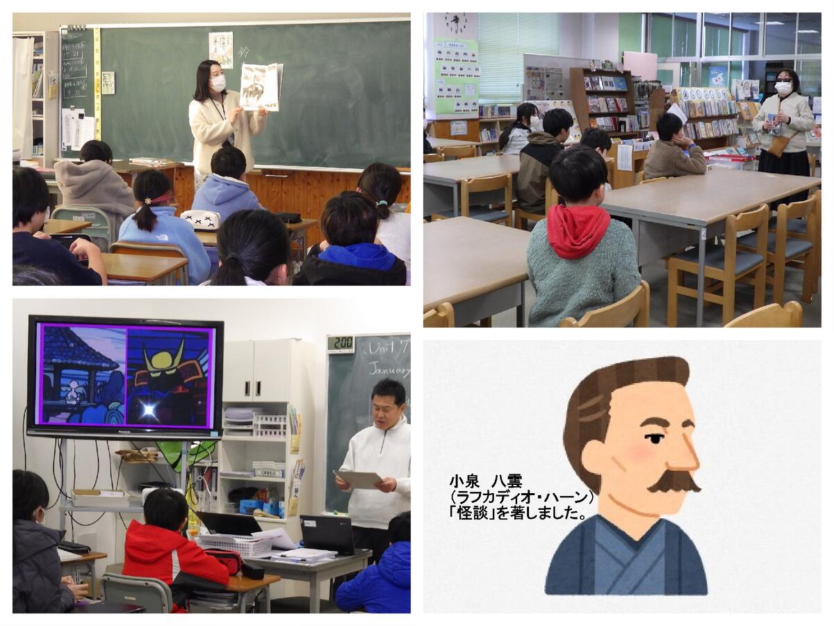 1月15日(木)の朝、校長、音楽専科、図書室の先生による読み聞かせをがありました。児童の学年や季節、学習内容との関連などを考えながら、それぞれの先生方が読み聞かせをする内容を決めます。校長からは、6年2組の児童へ、「耳なし芳一」「鳥取のふとん」の二つの話をしました。NHK朝ドラ「ばけばけ」でも話題の小泉八雲(ラフカディオ・ハーン)が、妻のセツから聞いた話を「怪談」として著し世界に紹介したものです。「耳なし芳一」は、歴史で勉強した源氏に滅ぼされた平氏の亡霊のお話でした・・・。他の先生からは、どんな話が聞けたでしょうか?