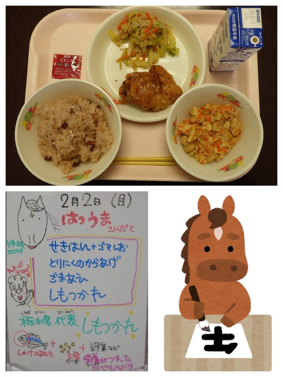 ・2月2日(月)「はつうまこんだて」せきはん、とりのからあげ、ごまあえ、しもつかれ