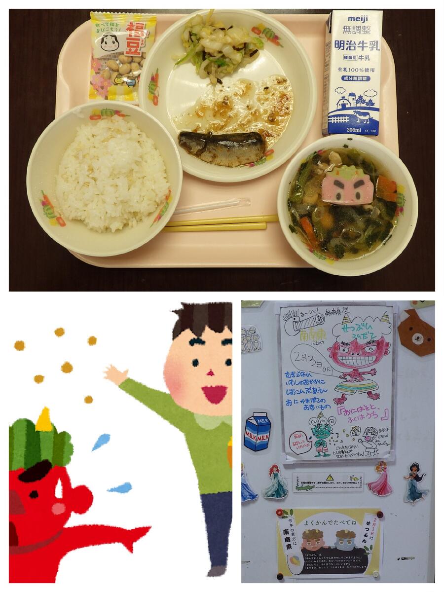 「節分」は、鬼を追い払って無病息災を願う日で、「立春」の前日にあたります。1階中央階段脇の給食コーナーでは、調理員さんが楽しいイラストを付けて献立紹介をしてくれています。子供たちは、今日のイラストを楽しみにしています。