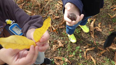 きれいな色の葉っぱ,とちの実,不思議な形のつるが見つかりました。