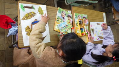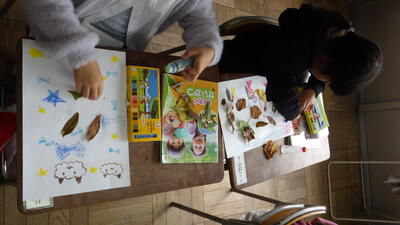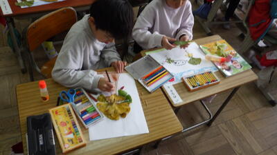 この日は,きれいな色の落ち葉を使って絵を描きました。