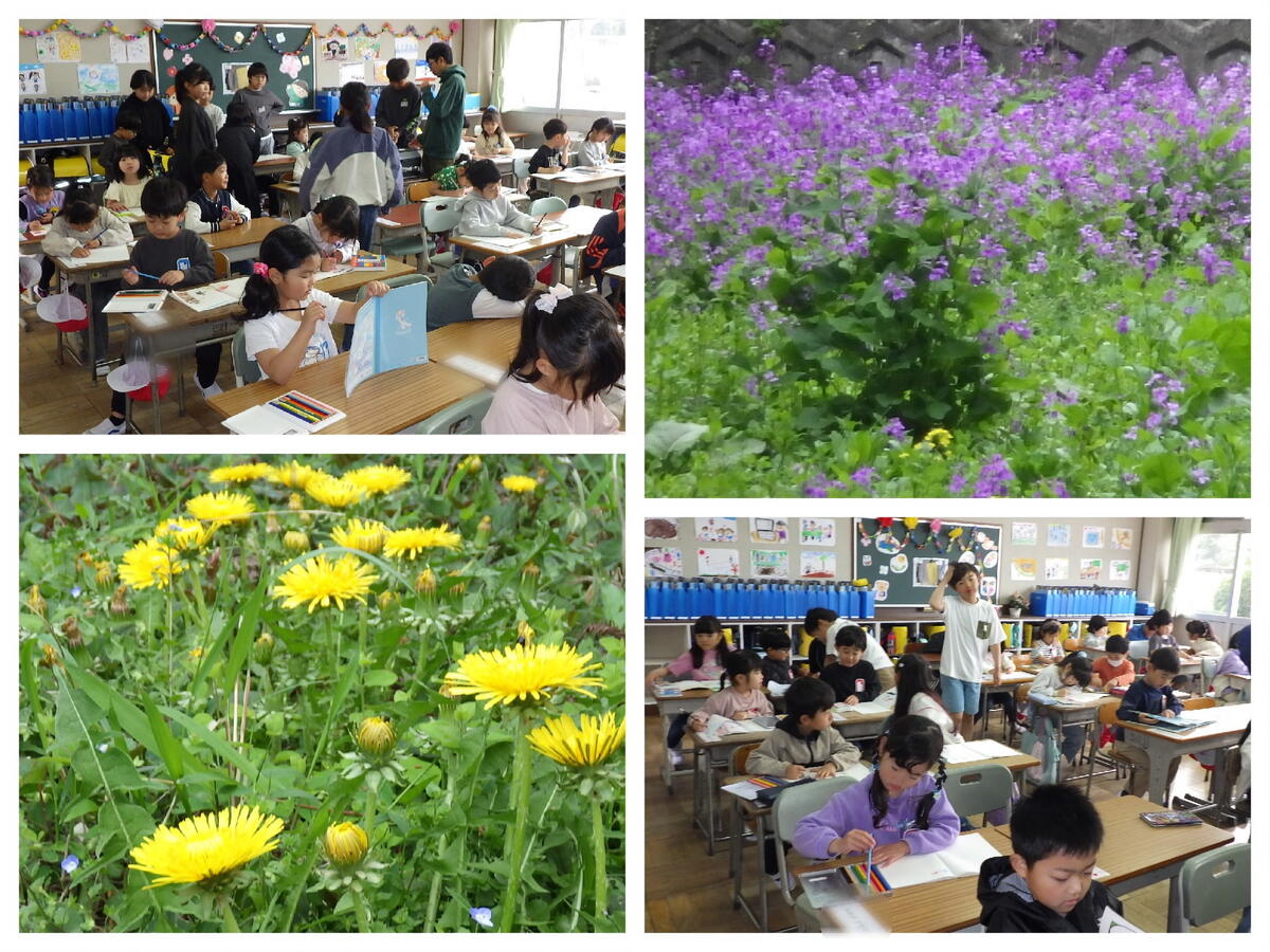 6年生が面倒を見てくれるお陰で、1年生は上手に朝の準備ができるようになりました。準備が終わったら、絵を描いたり本を読んだりして静かに過ごします。校庭には、春の花がたくさん咲き始めました。