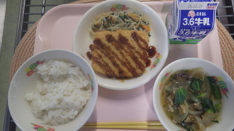 献立:麦入りごはん 牛乳 手作りハムカツ からしあえ 味噌汁