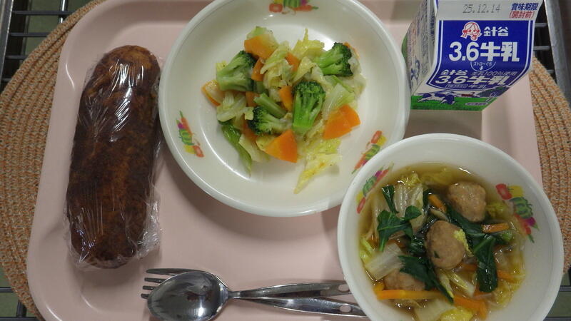 一覧へ 今日の給食 日時 2025年12月03日(水) 公開対象 パブリック 詳細 献立:揚げパン 牛乳 ゆでやさい 肉団子スープ 宇都宮市産:パン 栃木県産:小松菜 にんじん 牛乳 作成者 晃宝小学校 更新日時 2025-12-11 14:10:49