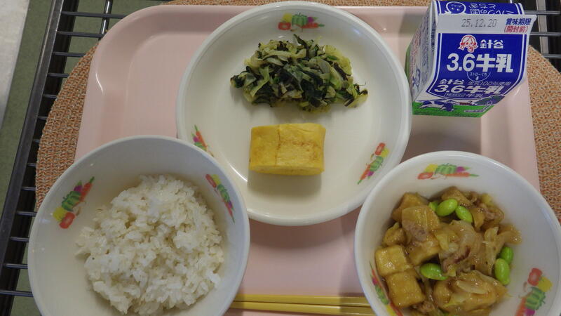 一覧へ 今日の給食 日時 2025年12月09日(火) 公開対象 パブリック 詳細 献立:麦入りごはん 牛乳 厚焼き卵 磯辺和え 凍り豆腐と野菜の炒め物 地域産:ほうれん草 宇都宮市産:米 栃木県産:牛乳 キャベツ 豚肉 作成者 晃宝小学校 更新日時 2025-12-11 14:16:45