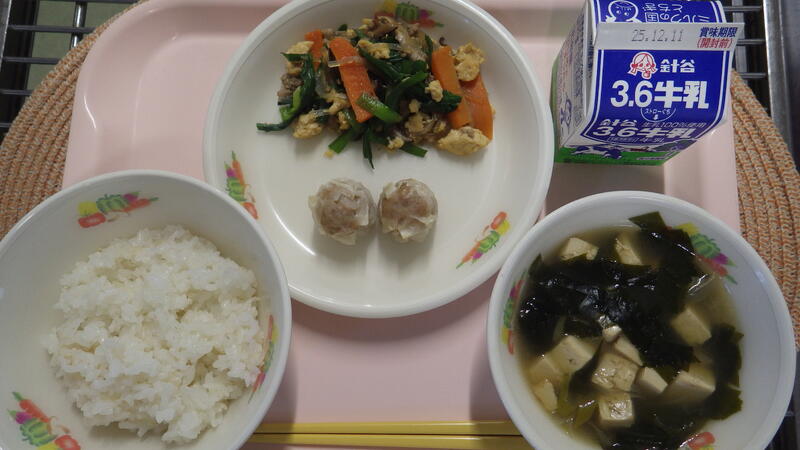 一覧へ 今日の給食 日時 2025年12月01日(月) 公開対象 パブリック 詳細 献立:麦入りごはん 牛乳 春雨とにらの炒め物 シュウマイ 豆腐の中華スープ 宇都宮市産:にら 栃木県産:ねぎ 牛乳 卵 作成者 晃宝小学校 更新日時 2025-12-11 14:07:14