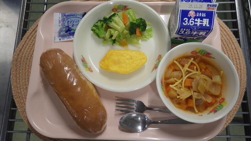 献立:コッペパン ブルーベリージャム 牛乳 オムレツ ゆでやさい ミネストローネスープ