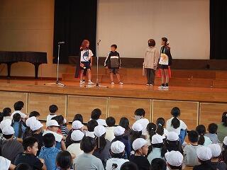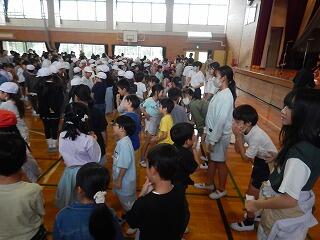 集会委員会が計画した「なかよし集会」が行われました。全校児童が体育館に集まり「おちた おちた」や「伝言ゲーム」を行いました。縦割り班での活動では,上級生が下級生に対して優しくサポートする様子が見られ,とても楽しい時間になりました。