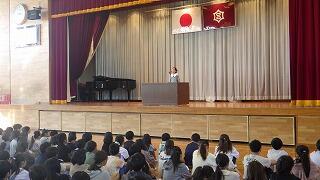 第1学期の終業式を行いました。校長からは,これまでに成長してきた様子を振り返り,2学期も引き続き,本校の合言葉「やさしく かしこく たくましく」を目指して,さらに成長してほしいと話しました。児童代表の言葉では,4年生の阿部さんが,1学期に頑張ったことを発表しました。とても堂々と発表することができました。