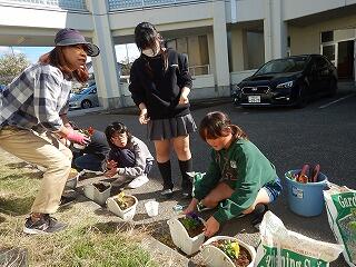 国本地域が花いっぱいになることを願う本校の地域協議会の行事で,今年度,2回目の活動になります。今回は校庭南側フェンス用プランターの植え替えを,環境委員と代表委員の6年生が,地域協議会委員さんと一緒に行いました。後日,フェンスに設置する予定です。