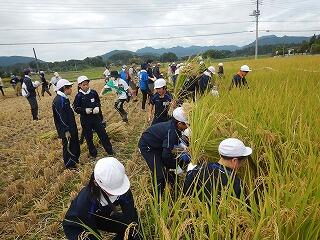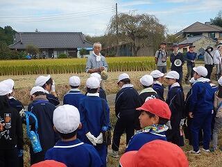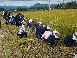 本校の特色の一つである農業体験学習「稲刈り」を行いました。1時間目に3,4年生,2時間目に2,5年生,3時間目には1,6年生が一緒に作業を行いました。高学年の児童が低学年の児童の面倒を見ながら,皆で協力して稲刈りを行うことができました。田植えのときにもお世話になった半田様をはじめ,地域協議会,PTA保護者の皆様のご協力もいただき,おかげさまで無事に作業を進めることができました。大変お世話になりました。