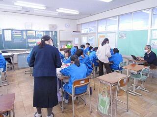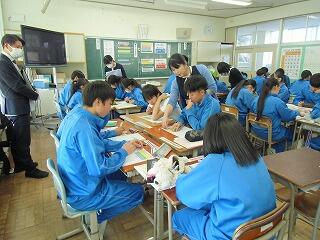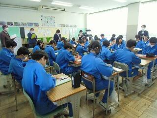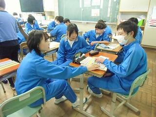 12月23日(火)5時間目、市教委から指導主事をお迎えし、国語科の研究授業を行いました。見出しに合うように新聞記事を書き換える内容で、ネガティブな表現をポジティブな表現に変えながら、表現の効果や自分の考えを伝えていくことを学びました。どういった表現が適切なのかをペアやグループで話し合いながら進めており、とても難しい内容だと感じましたが、生徒は熱心に取り組んでいました。