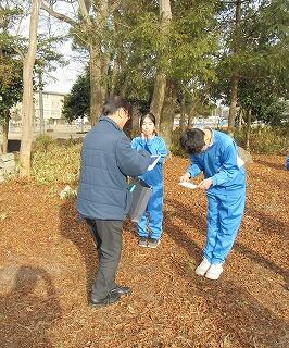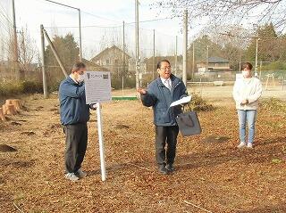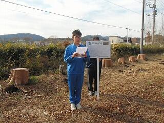 クニノキベンチは、学校がまだ木造校舎だった頃、将来の建て替えに備えて地域の方々が植えてくださった檜の木を今年3月に伐採した切り株のことで、本校の南西にあります。高く大きく成長した檜でしたが、時代とともに木造校舎が姿を消し、危険性や近隣住宅への影響を考慮し、また同窓会の方とも相談した上で伐採されたようです。先人の功績を後世に伝えるべく、切り株を塗装してベンチとして活用し、生徒から名称を募集して「クニノキベンチ」と名付け、12月23日(火)、同窓会で看板を設置しました。設置の際には、名称募集に応募し最終候補に残った生徒と同窓会長同席のもと行いました。