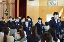「茶摘み」のお茶のみが、今日から1年生になりました。今日は、1-1の生徒が、3年生が作った手作りのお茶を美味しそうに飲んでいました。この後、1-2、1-3、1-4の順にお茶を味わっていきます