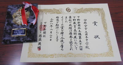 第56回下野教育美術展小中学校の部の表彰式が2月20日(金)FKDインターパーク店で行われ、本校は団体賞の下野新聞社社長賞を受賞し、賞状と盾をいただきました。情操豊かな生徒たちの努力と美術科及び美術部の先生方の熱心な指導の賜物であると思っています。