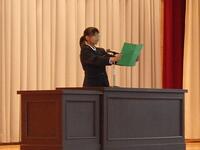表彰式では、栃木県総合体育大会、部活動の各種大会、宇河地区新人体育大会、栃木県少年の主張発表河宇地区大会、青少年読書感想文コンクール、栃木県吹奏楽コンクール、うつのみやジュニア芸術祭学校音楽祭、宮っ子心の教育表彰 教育長奨励賞を受賞した生徒に、一人一人賞状を手渡しました。様々な分野で活躍した生徒の皆さん、本当におめでとうございます。今後の活躍を期待しています。また、任命式では、後期生徒会長や副会長など執行部9名に任命書を手渡しました。生徒会活動を盛り上げ、よりよい学校を目指して努力していくことを期待しています。