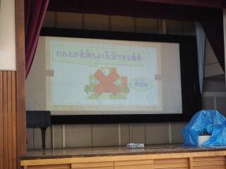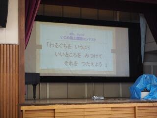 「学校はだれもが気持ちよく生活できる場所」でなければいけない。そのために,チクチク言葉ではなく,ふわふわ言葉をたくさん使っていきましょう。というお話をしていただきました。みんな真剣に話を聞くことができました。子どもたちの名札には「いじめをしない」という印の黄色いリボンが入っています。