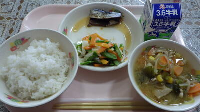 今日のおススメは、さんまです。カボスとレモンで風味がよく、やわらく煮込んでいるため低学年児童も骨を気にせず食べられました。道産子汁は、具だくさんで定番のおいしさでした。