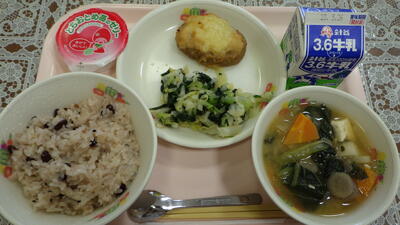 【本日のお祝い献立】赤飯、ハンバーグ、おひたし、味噌けんちん汁