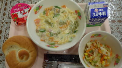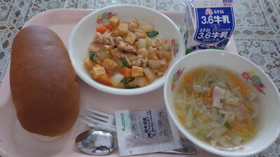 【本日の献立】鶏肉と野菜のケチャップ和え、野菜スープ、ミルクパン