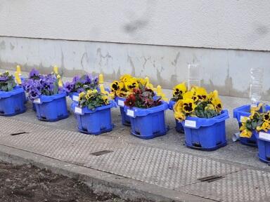 フラワーロードの草取りが行われています。地域の方,保護者の方,子どもたち,たくさんの人が集まりました。通学路として利用しているフラワーロードは,皆さんのご協力により整備されています。ありがとうございます。