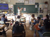 3年生の総合的な学習で「導犬ふれあい学習」を行いました。東日本盲導犬協会から2歳のイズモ君が来てくれました。とてもお利口で大勢の3年生の前でもずっとおとなしく,訓練士の方の指示をよく聞いて,的確に動いていました。視覚障害の種類や盲導犬育成に関する説明をしていただきました。またアイマスク体験もしました。大変勉強になりました。