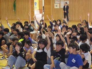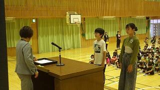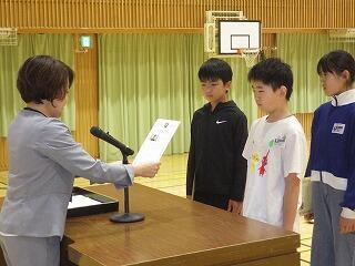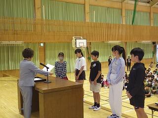今朝は全学年が体育館に集まり、まずは、表彰式を行いました。