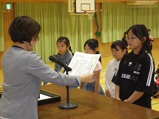 校長表彰は、「明るく やさしく 根気よく」という本校の合言葉に沿って、「あいさつ金賞」「おもいやり金賞」「がんばり金賞」を授与するものです。