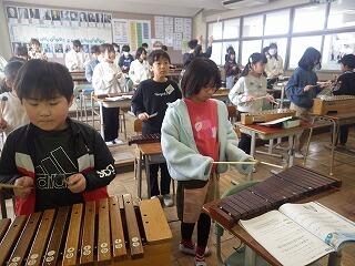 2年生は、第2音楽室で、「チャチャマンボ」の打楽器演奏をしていました。