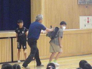 「ランドセルをつかまれたらランドセルから体を外して逃げる」「手をつかまれたら両手を組んで振り払う」「助けて~と大声を出しながら走る」などのポイントをしっかり演示してくれた代表の二人です!