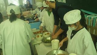 食器やおかずを配る仕事に集中して取り組んでいます。