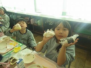 「塩むすび」「ひじきと枝豆」「しゃけ」「唐揚げ」「焼きおにぎり」「三食」「キャラむすび」などなど、それぞれのおにぎりを笑顔でほおばりました。