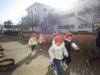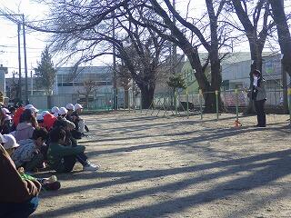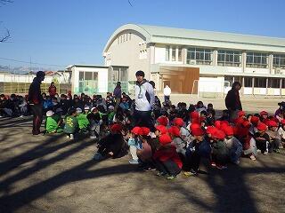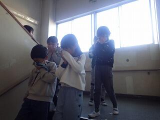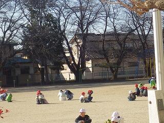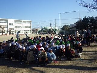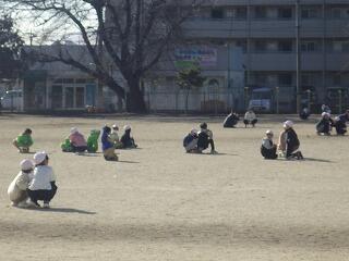 校庭で遊んでいた児童は、広い場所まで移動してしゃがみます。