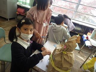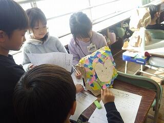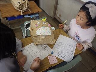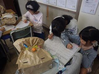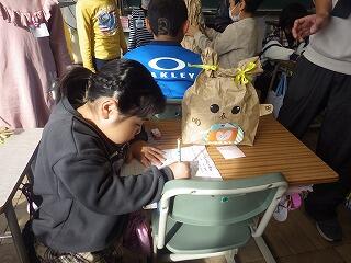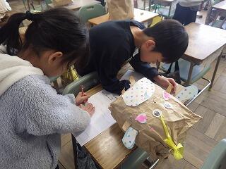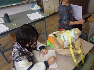 紙袋を使って作った作品をお互いに見て、よかったところなどを記録します。