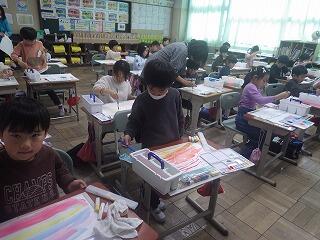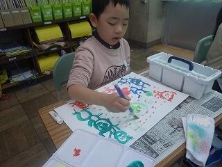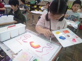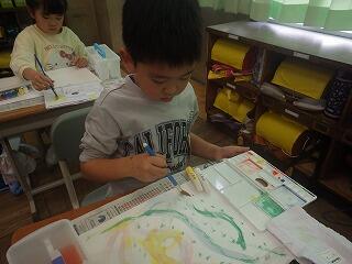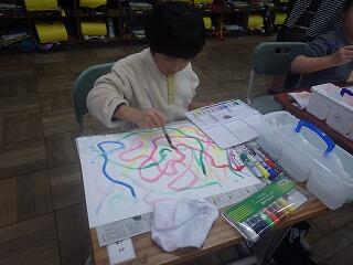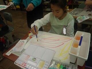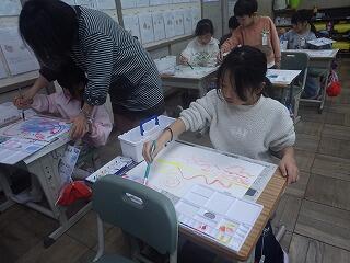 「わあ!こんな風にぐるぐるするのも素敵だね」「〇〇さんの色使いもきれいだね」「点々を描くのもいいねえ」など、教師が子供たちの創意を次々に価値づけする中、みんな、集中して画用紙に向かっていました。