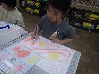 自分の好きな3色をパレットに出し、水で薄めながら、画用紙に思い思いに描いていきます。